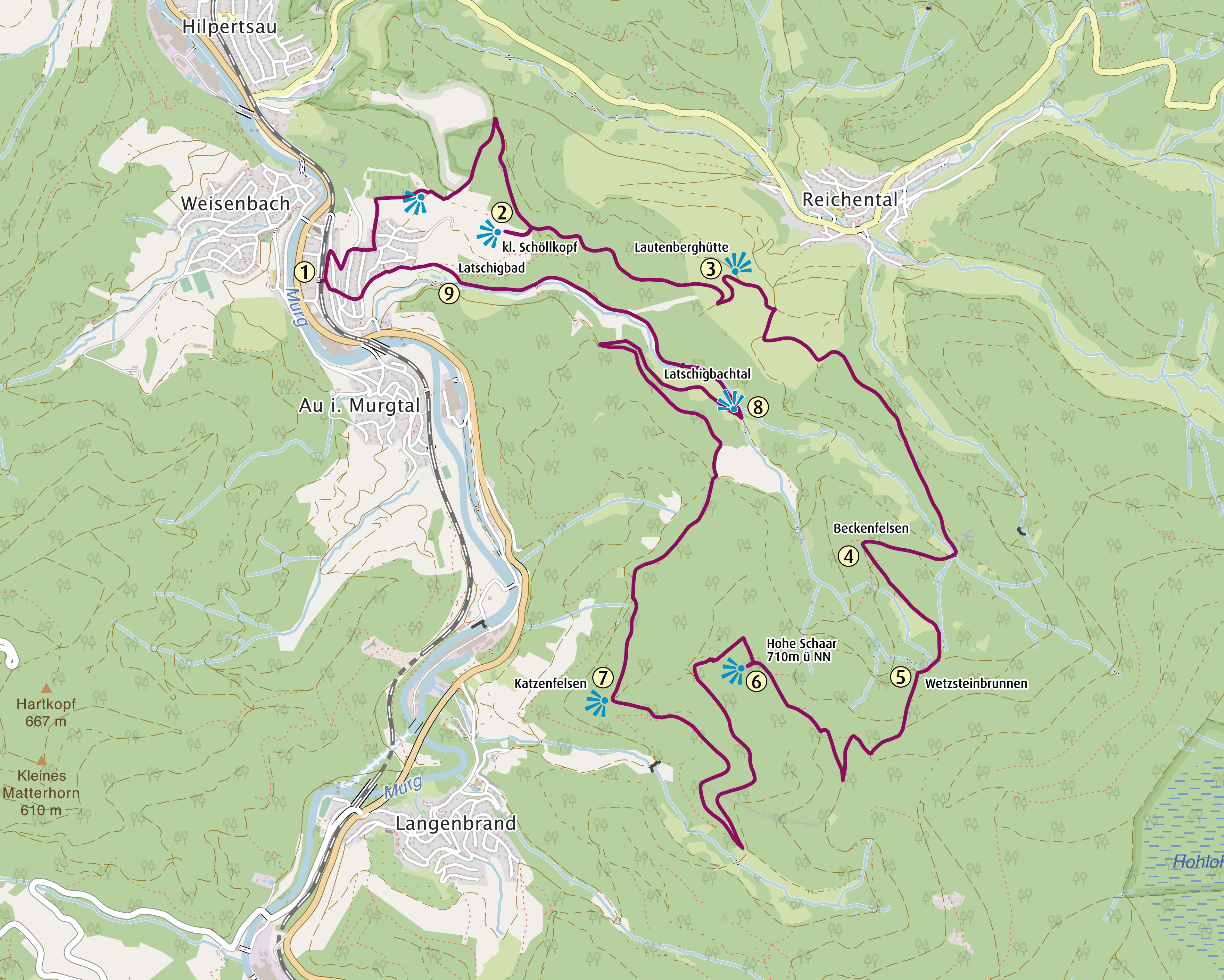 Die Etappe startet und endet an der Stadtbahnhaltestelle (1) in Weisenbach.